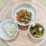 給食:麦ごはん・豚肉のつけ焼き・厚揚げとさつまいものみそ汁【約279Kcal】