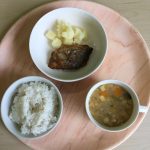 給食:麦ごはん・魚のごまみそ焼き・粉ふきいも・具だくさんみそ汁【約242Kcal】