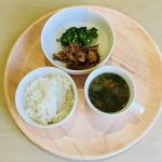 給食:麦ごはん・ポークチャップ・ゆでブロッコリー・チンゲンサイのスープ【約227Kcal】