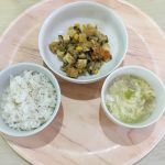 給食:麦ごはん・厚揚げとツナのカレー炒め煮【約299Kcal】