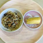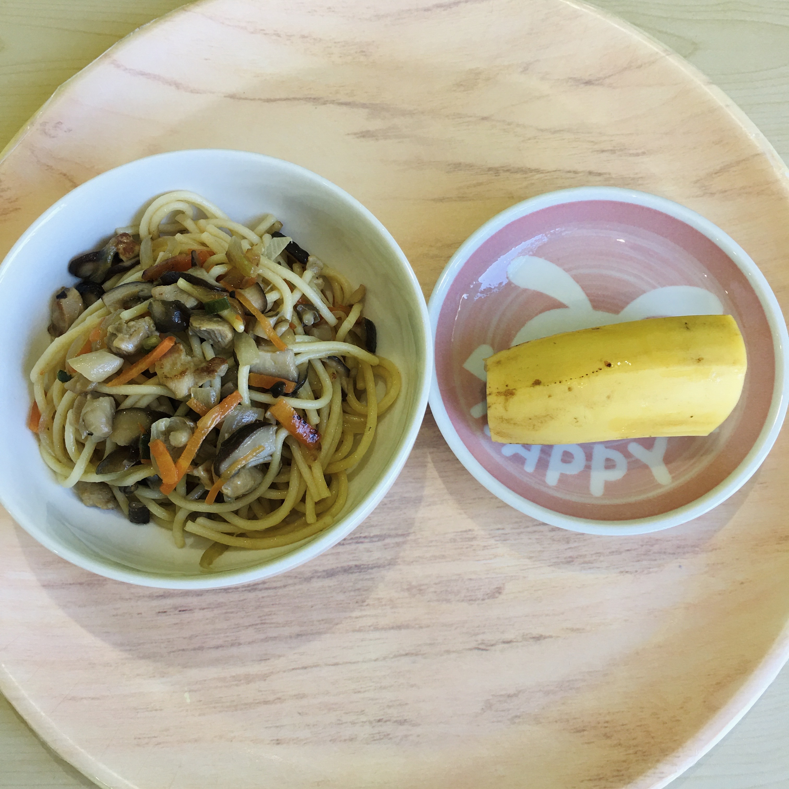 🥄今日の給食・おやつ🥄11/8(土) 2025年11月8日 0 あかりのこ保育園, あかりのこ堅粕園, あかりのこ香住ヶ丘園 推定エネルギー必要量(1~2歳児) 男:950Kcal/日 女:900Kcal/日 給食:和風スパゲティ・バナナ【約216Kcal】 おやつ:豆乳・じゃこと菜っ葉の混ぜごはん【約164Kcal】 本日の塩分目安量:約1.3g