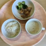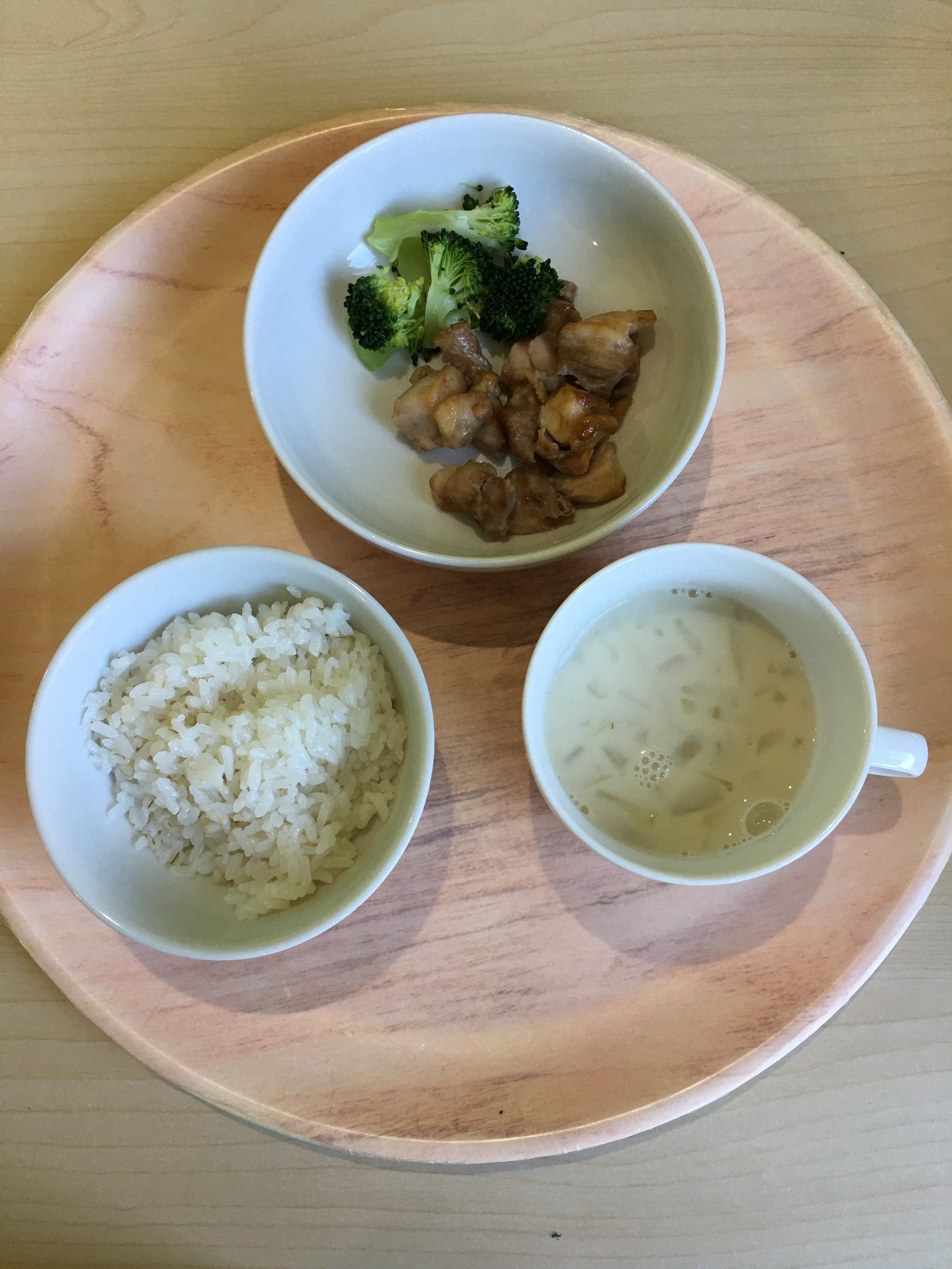 給食:麦ごはん・ローストチキン・ゆでブロッコリー・キャベツとコーンの豆乳スープ【約272Kcal】