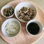 給食:麦ごはん・清汁・豚肉のきのこ炒め・切り干し大根のみそ汁【約245Kcal】