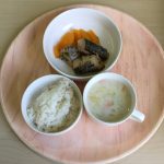 🥄今日の給食・おやつ🥄 1/8(木) 2026年1月8日 0 あかりのこ保育園, あかりのこ堅粕園, あかりのこ香住ヶ丘園 推定エネルギー必要量(1~2歳児) 男:950Kcal/日 女:900Kcal/日 給食:麦ごはん・魚の香味焼き・焼きかぼちゃ・洋風みそ汁【約294Kcal】 おやつ:スキムミルク・小松菜とプルーンのマフィン【約113Kcal】 本日の塩分目安量:約1.7g