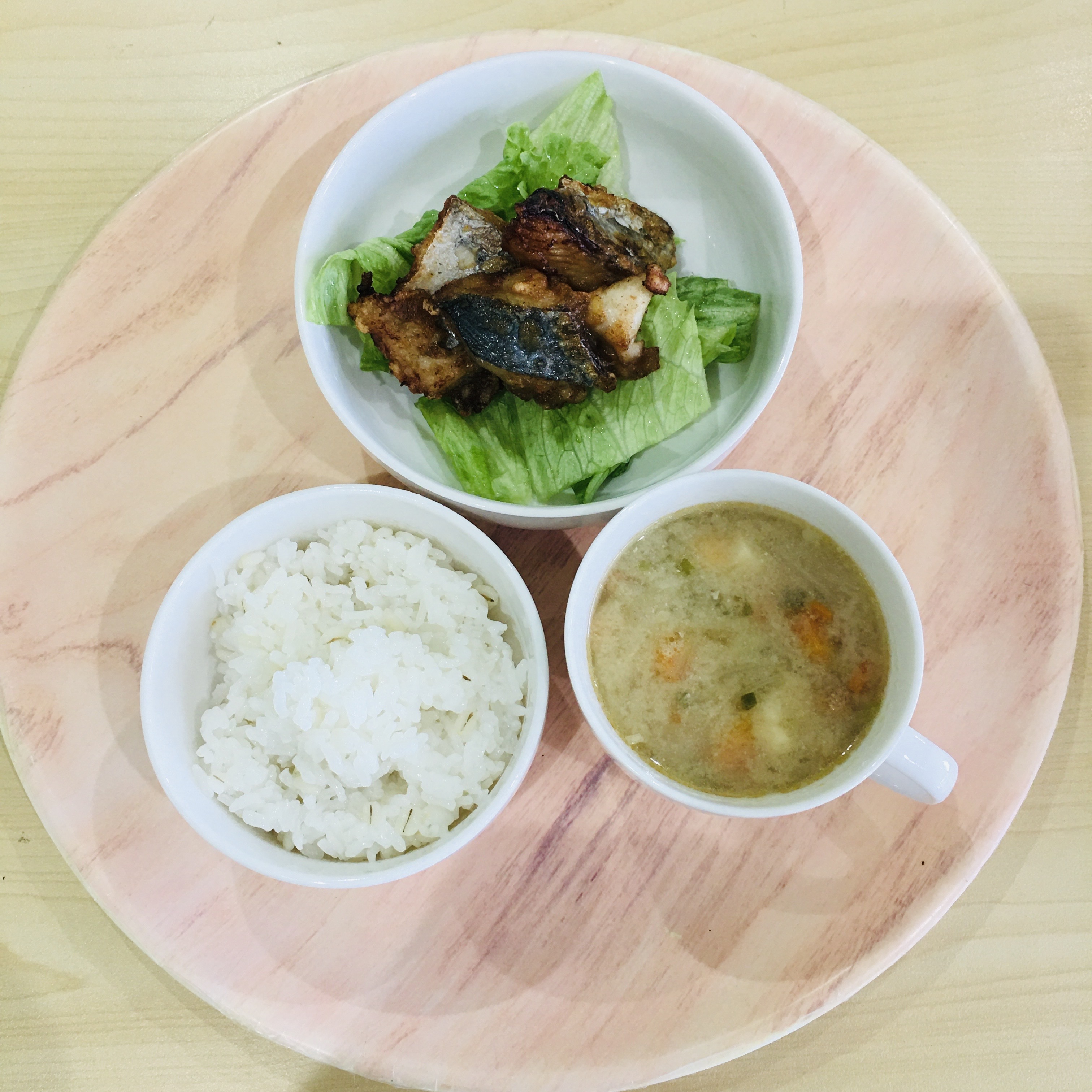 給食:麦ごはん・魚の竜田揚げ・レタス・じゃがいものみそ汁【約303Kcal】
