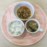 給食:麦ごはん・鶏肉と大根のカレーじょうゆ煮【約258Kcal】