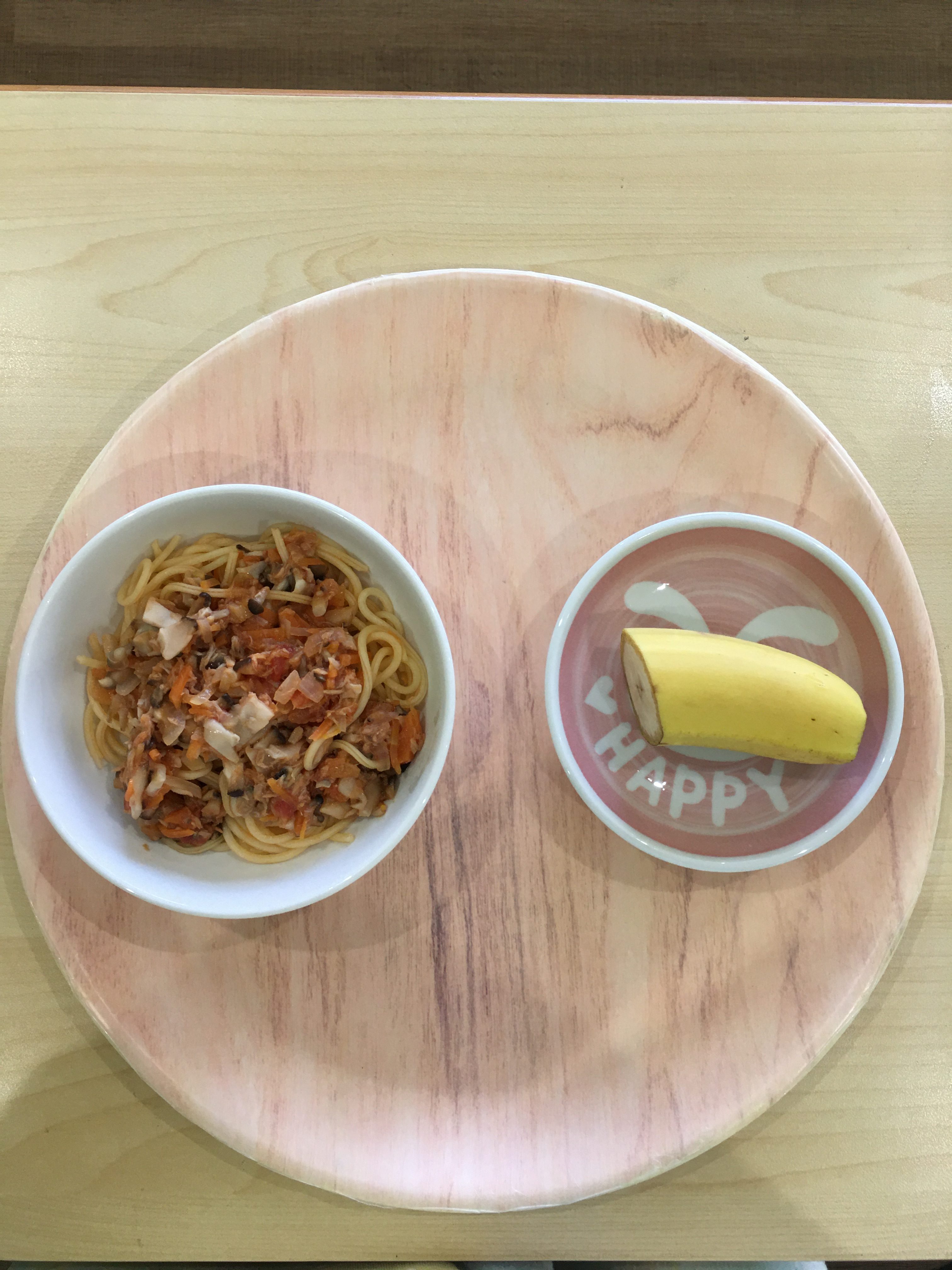 🥄今日の給食・おやつ🥄1/31(土) 2026年1月31日 0 あかりのこ保育園, あかりのこ堅粕園, あかりのこ香住ヶ丘園 推定エネルギー必要量(1~2歳児) 男:950Kcal/日 女:900Kcal/日 給食:きのこスパゲティ・バナナ【約230Kcal】 おやつ:豆乳・さつまいものパイン煮【約129Kcal】 本日の塩分目安量:約1.0g