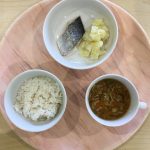 🥄今日の給食・おやつ🥄 2/6(金) 2026年2月6日 0 あかりのこ保育園, あかりのこ堅粕園, あかりのこ香住ヶ丘園 推定エネルギー必要量(1~2歳児) 男:950Kcal/日 女:900Kcal/日 給食:麦ごはん・魚の塩焼き・粉ふきいも・中華スープ【約258Kcal】 おやつ:牛乳・きなこ米粉クッキー【約139Kcal】 本日の塩分目安量:約1.4g