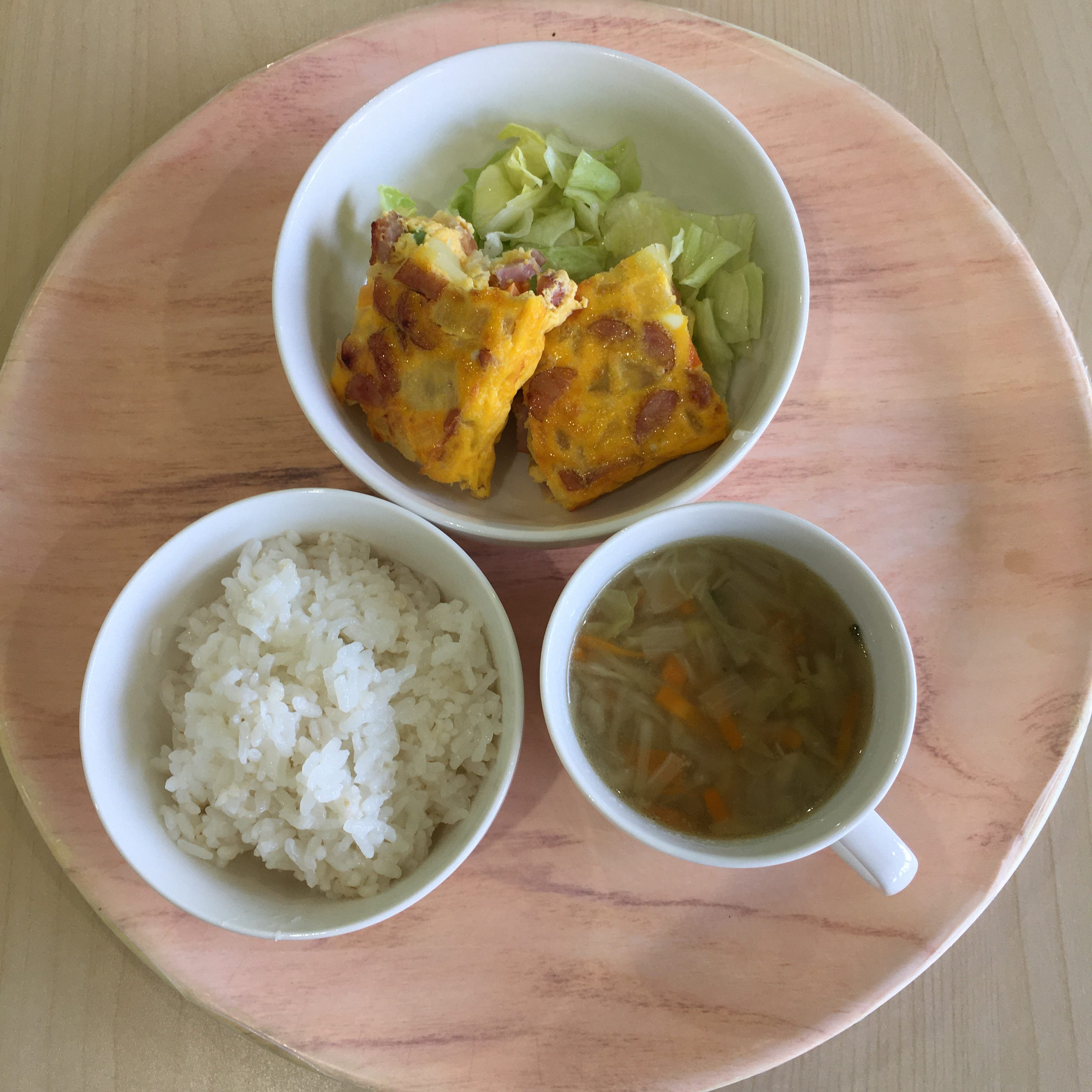 給食:麦ごはん・ウインナーのオムレット・レタス・チキンスープ【約272Kcal】